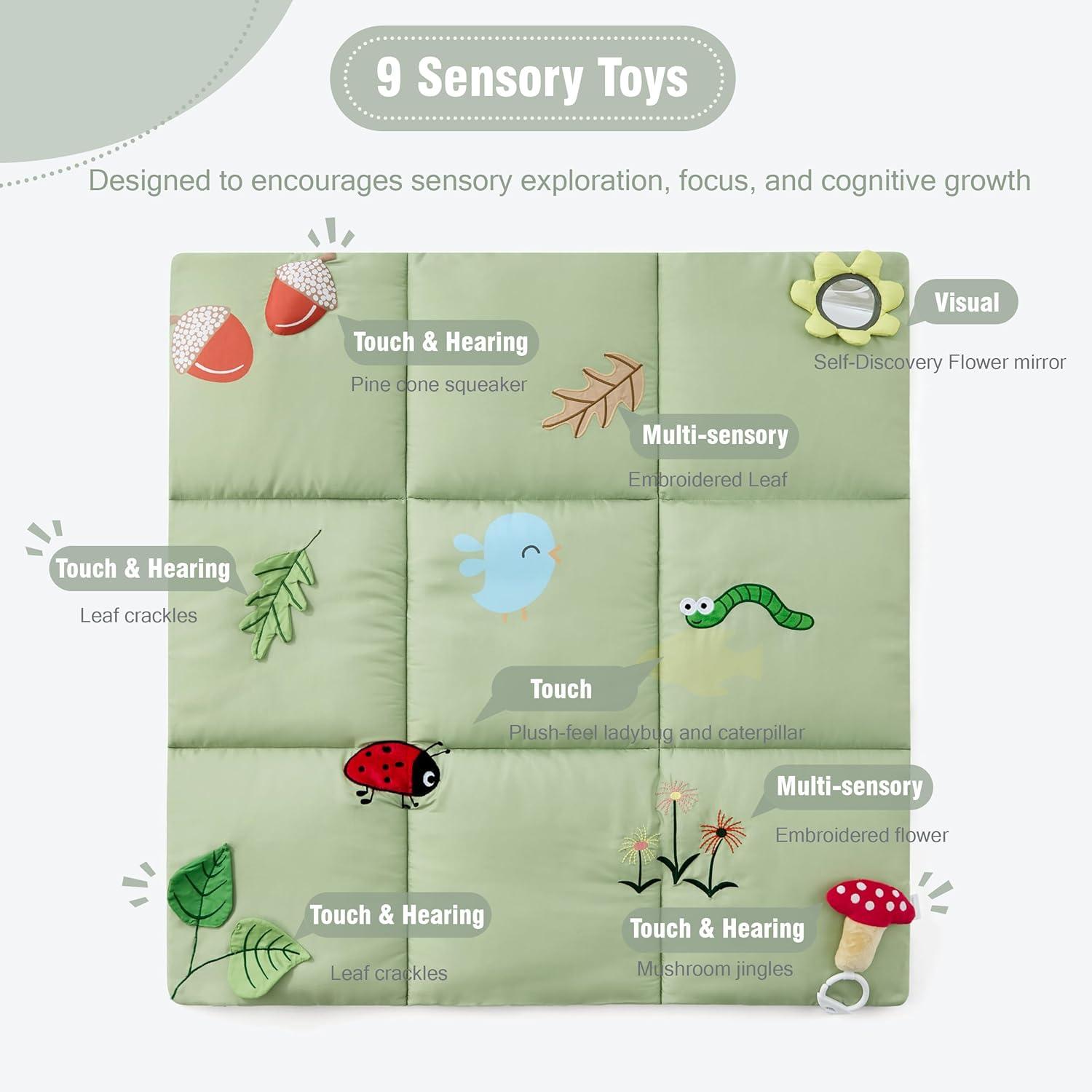 【Grows with Your Baby】The sensory mats evolves with your little one through every stage — from newborn lay and play, to tummy time, to sitting up and exploring. Perfect for babies from newborn to 12 months, this muscle mat baby provides age-appropriate fun and support. Younger babies can enjoy tummy time to strengthen their muscles, while older ones can sit up and engage with the detachable sensory toys for endless discovery.