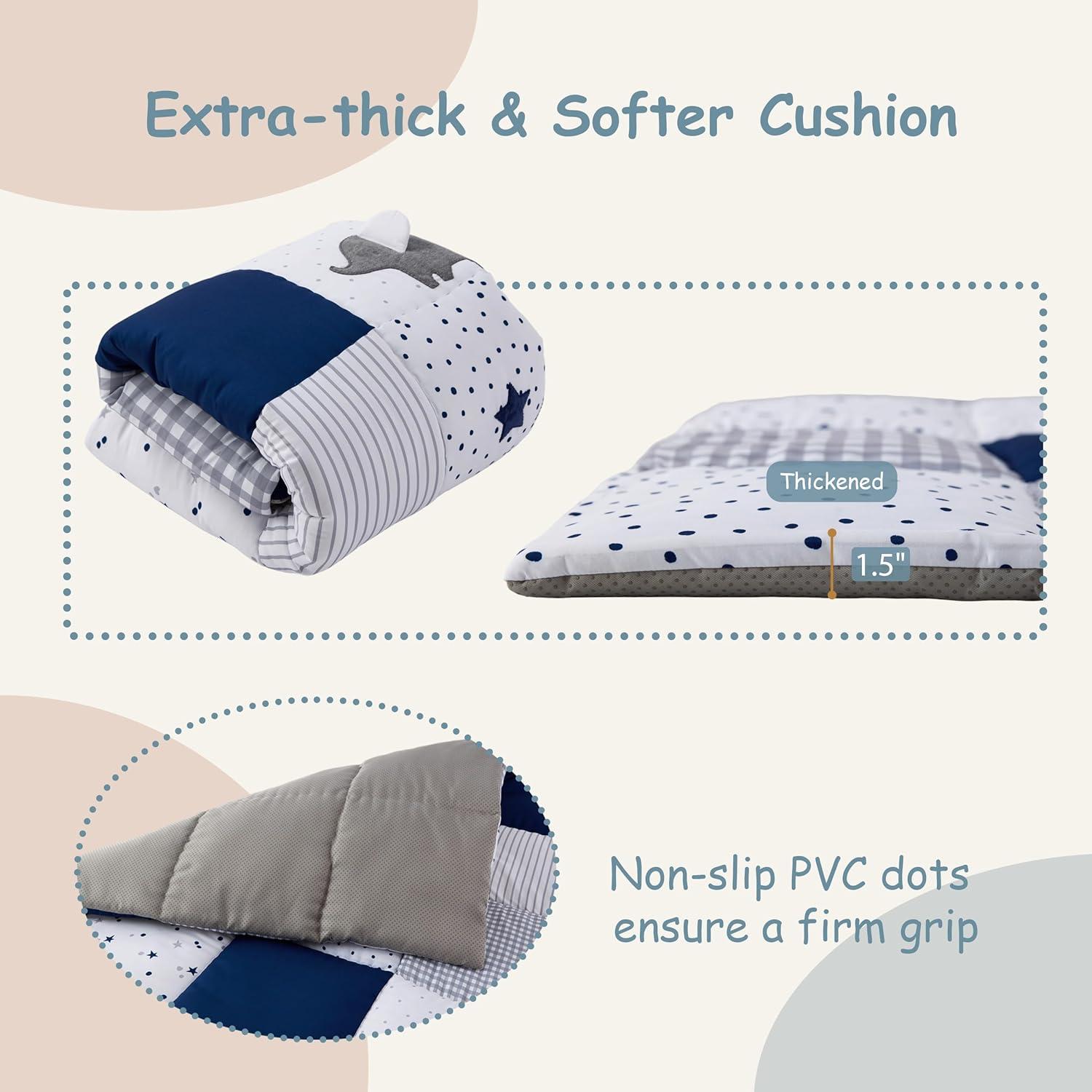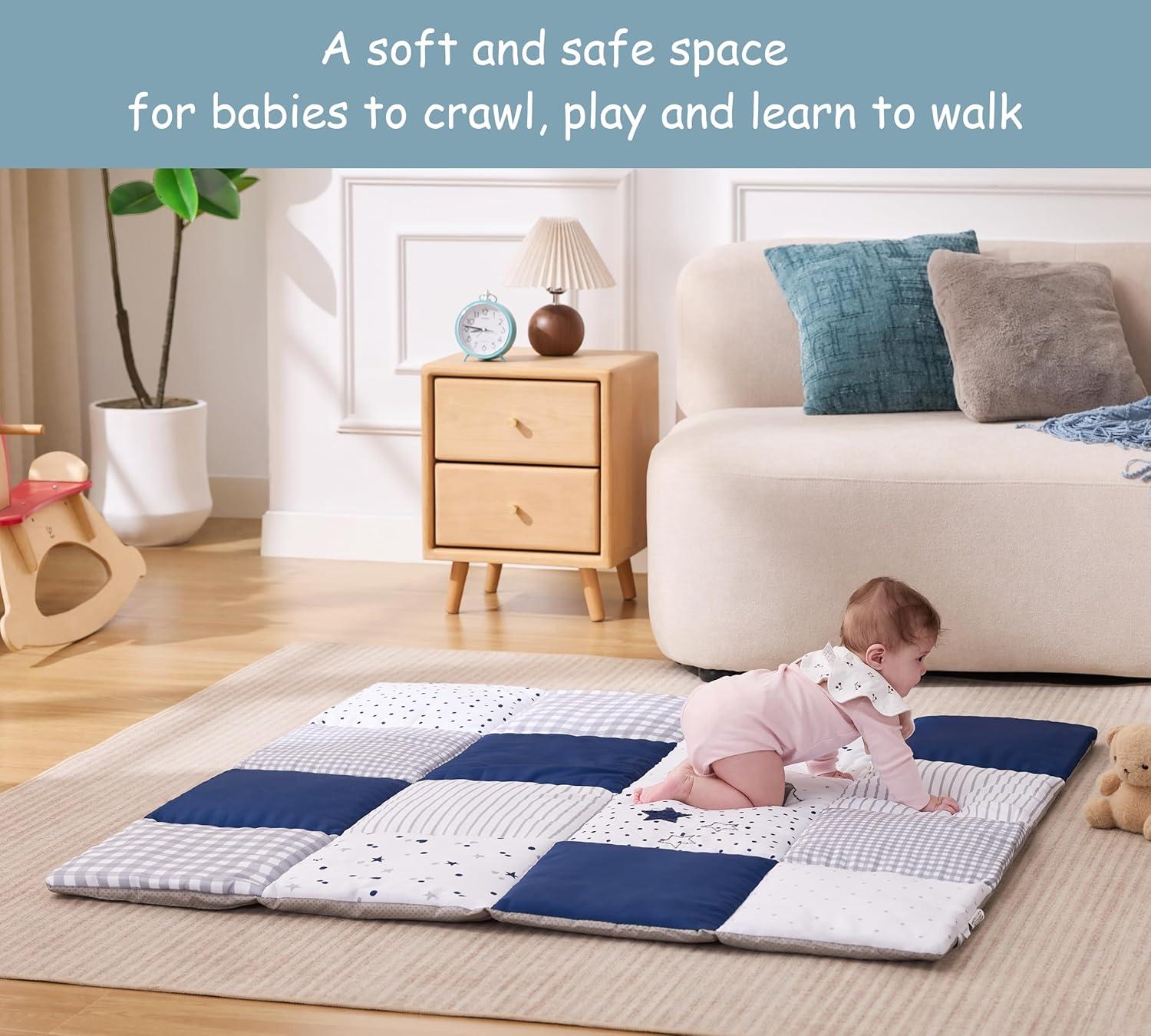 【Extra-Thick & Ultra-Soft】Our baby floor play mat hand-quilted with a plush polyester surface, this toddler play mat offers extra thick padding and a soft, cushioned feel—providing babies and toddlers a cozy, comfortable space to roll, crawl, and play, ensuring pure comfort during their earliest adventures.