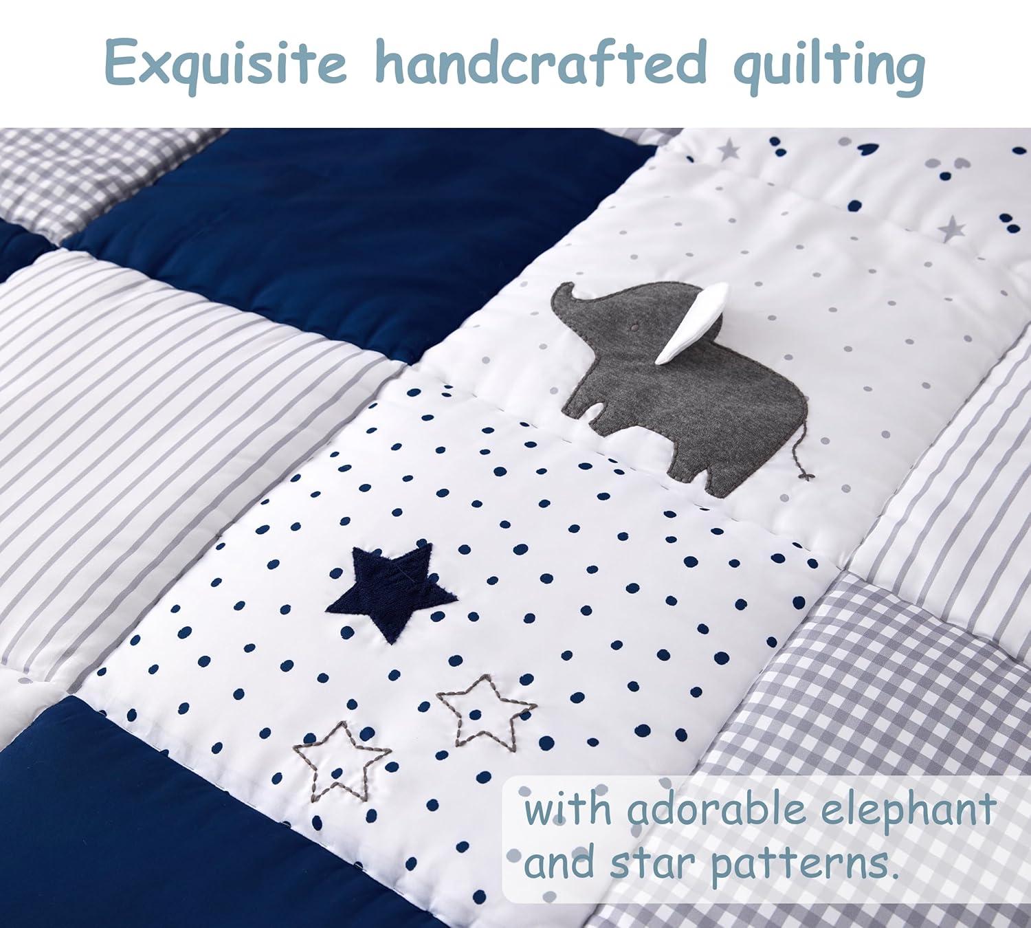 【Exquisite Handcrafted Quilting】The surface of this baby activity mat showcases an artfully crafted hand-quilted design, forming neat and elegant little squares. Adorned with colorful patches featuring adorable elephant and star prints, this tummy time mat offers a charming, playful look while ensuring lasting durability — a design sure to capture your baby’s heart.