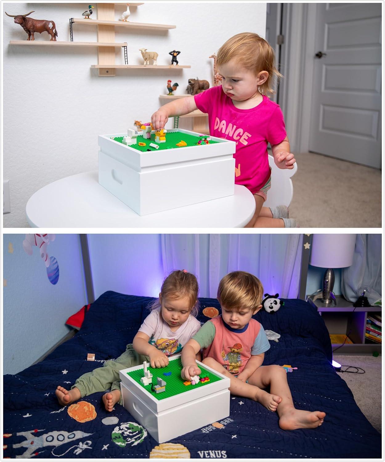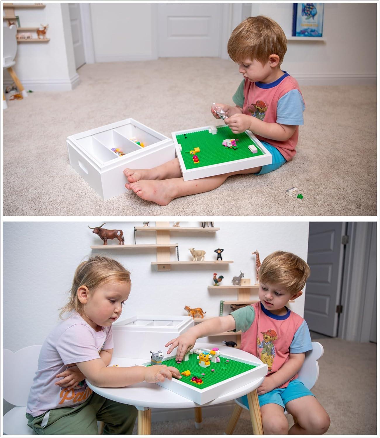 【Building Baseplate Lid Design】 Goodbye, clutter! The building storage organizer is durably crafted and offers plenty of room to keep their lego bricks, toys and more off the ground. Our buliding organizer container features with a built-in building plate lid. Made of quality manufactured wood, the material used makes it an eco-conscious alternative to plastic bins. it is Compatible with most major Lego and Duplo Bricks. The creative base plate allows your child to let their imagination run wild, it provides the perfect play space for building fun.