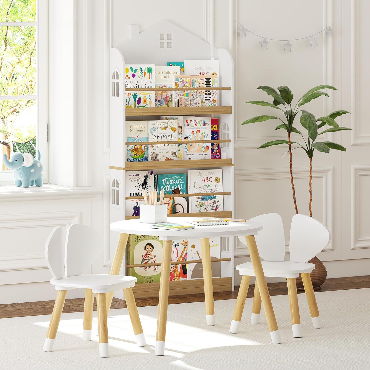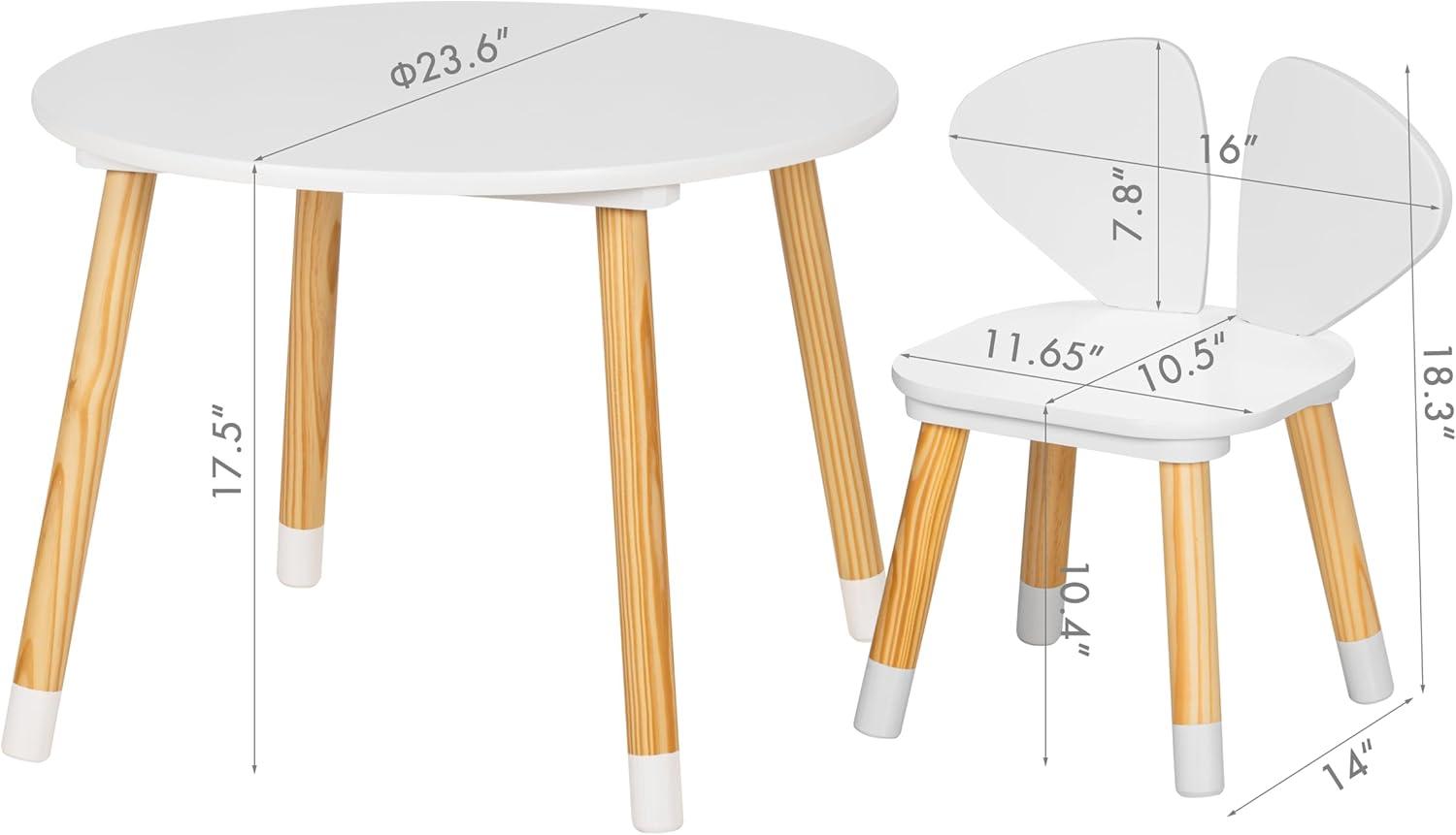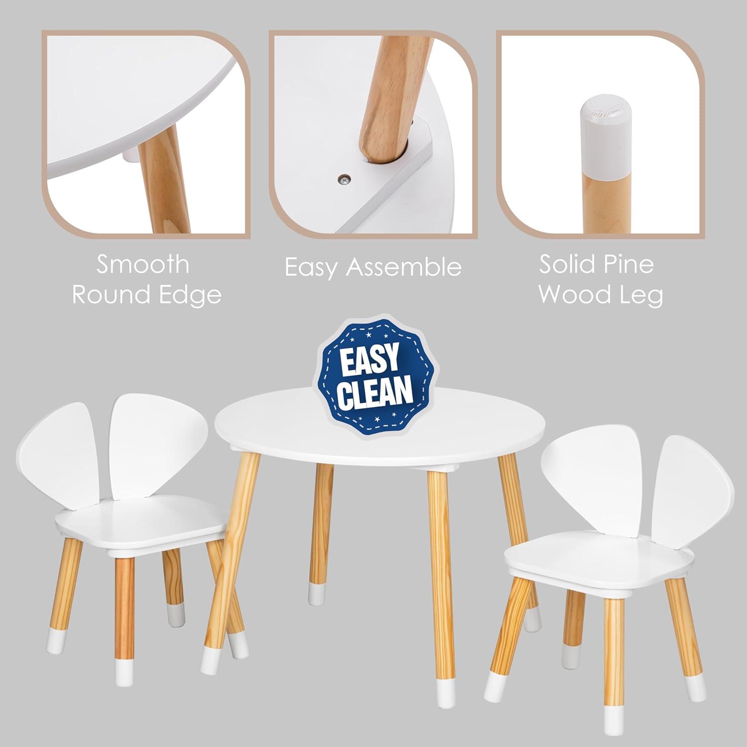Quality children's tables: Kids table and chairs made of high-quality pine and artificial wood, strong and durable, anti-corrosion and moisture; white painted table and chairs with smooth and wear-resistant surface, will not cause any damage to the children.